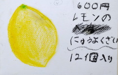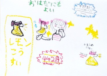 | 2 | レモンがすっぱいかおりがしてギザギザに描いて、さっぱりしていたから青っぽい色も入れた。 | |